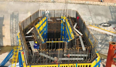9米節(jié)段液壓爬模的使用是一次挑戰(zhàn)、一次跨越、一次革命。標(biāo)志著主塔施工裝備邁上了新臺(tái)階,為實(shí)現(xiàn)主塔智能化、綠色化、快速化建造,項(xiàng)目部開展了各項(xiàng)創(chuàng)新研究。一是采用大噸位高爬架液壓爬模,架體連成整體,在爬升、澆筑中更加平穩(wěn)、安全。二是配置液壓脫合模系統(tǒng),替代傳統(tǒng)手動(dòng)機(jī)械脫模,提高了脫模工效。三是采用智能液壓控制系統(tǒng),實(shí)現(xiàn)同步爬升。配置視頻、風(fēng)速、壓力、位移等信息反饋智能監(jiān)控系統(tǒng),實(shí)現(xiàn)對(duì)結(jié)構(gòu)、環(huán)境、養(yǎng)護(hù)實(shí)時(shí)監(jiān)測(cè)。四是自帶智能養(yǎng)護(hù)系統(tǒng),實(shí)現(xiàn)混凝土冬季自動(dòng)蒸養(yǎng),其他季節(jié)造霧養(yǎng)護(hù)。五是設(shè)置專用電纜線槽、豎直旋梯、衛(wèi)生間、消防水箱、專用排污管道,實(shí)現(xiàn)標(biāo)準(zhǔn)化作業(yè)、綠色施工。