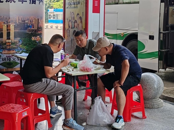 “做好熱情周到服務(wù),不僅能夠給來銅新生留下第一美好印象,讓新生愛上銅陵,更是我們客運(yùn)公司不斷自我優(yōu)化、提升服務(wù)品質(zhì)的追求?!痹摴矩?fù)責(zé)人說。9月10日,周日抵銅新生格外多些,該公司駐守站點(diǎn)志愿人員臨近中午只能就地盒飯解決,忙里偷閑還不忘交流完善工作細(xì)節(jié)。