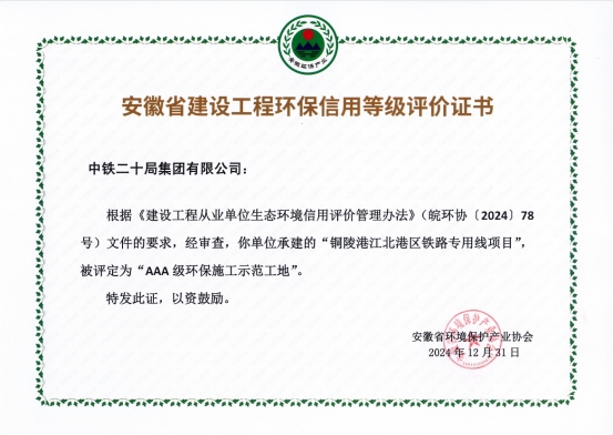 近日,安徽省環(huán)境保護(hù)產(chǎn)業(yè)協(xié)會(huì)公布2024年第5批建設(shè)工程從業(yè)單位生態(tài)環(huán)境信用評(píng)價(jià)結(jié)果,銅陵江北港鐵路專用線項(xiàng)目榮獲安徽省“AAA級(jí)環(huán)保施工示范工地”榮譽(yù)稱號(hào)。