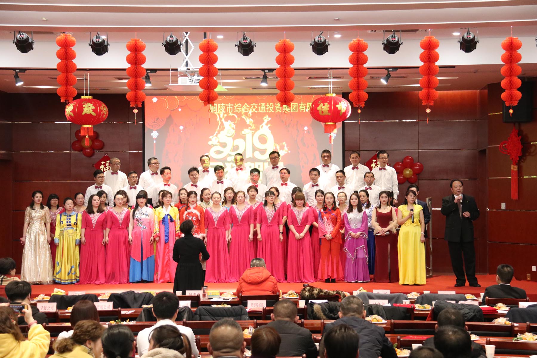 17時30分,晚會在大合唱《春天的故事》中拉開序幕,深情恢弘的演唱瞬間感染了在場所有人。朗誦《相約今天 展望未來》、二胡演奏《紫色激情》、歌曲《我的未來不是夢》、《驛動的心》、《東方之珠》、《明天會更好》、《外面的世界》等節(jié)目展現(xiàn)了集團公司全體職工對未來幸福新生活的向往與憧憬。手勢舞《中華民族》、舞蹈《今夜無眠》、相聲《不忘初心》、《三句半》等節(jié)目贏得了全掌觀眾陣陣掌聲,將整場演出推向了高潮,晚會在合唱《拜新年》的歌聲中緩緩落下帷幕。美好的祝福在歌聲里傳遞,新年的激情在舞姿中釋放。整場聯(lián)歡會以歌舞為主,匯聚了器樂、朗誦、小品、曲藝等各種藝術形式,訴說著交投兒女自己的故事。