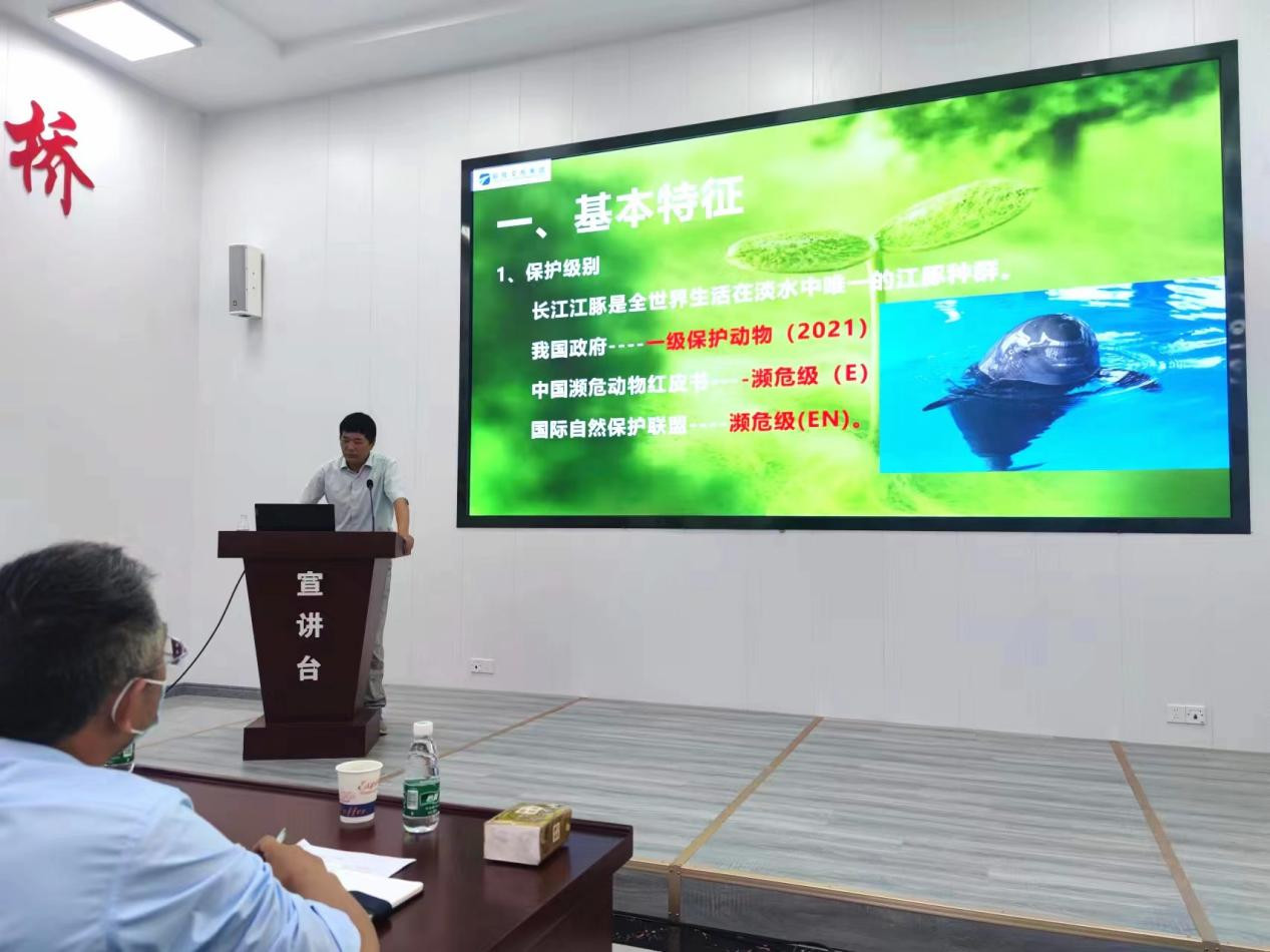 在世界環(huán)境日活動中,江豚保護專家鄭邦友結合自己近四十年江豚保護和科研經歷,以詳實的視頻和照片,向參訓人員介紹了長江江豚的基本特征、救護要點和運輸方法,并現場發(fā)放環(huán)保宣傳手冊,切實提高G3公鐵橋參建人員的環(huán)保意識。