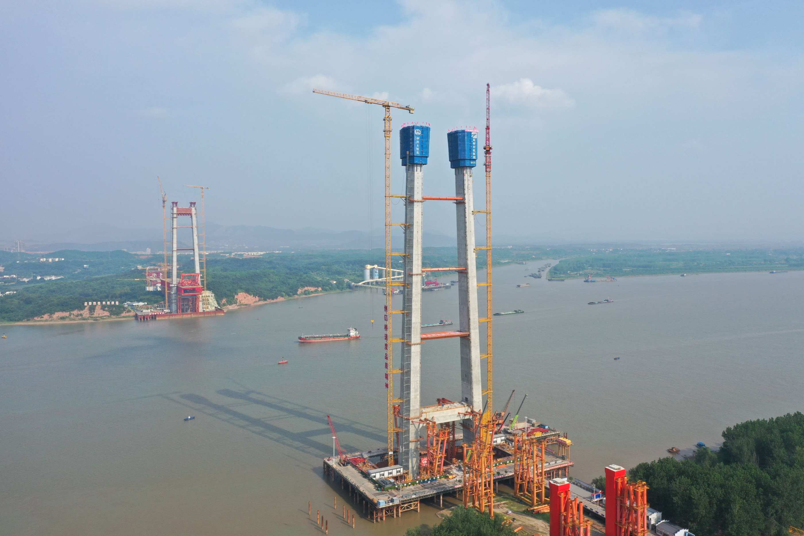 G3銅陵長江公鐵兼具斜拉橋和懸索橋兩種橋型的優(yōu)勢,具有“跨度大、荷載重、結(jié)構(gòu)新”的特點(diǎn)。大橋路線全長11.88公里,其中跨江主橋長1505米,主跨988米,具有“高速公路、城際鐵路、貨運(yùn)鐵路”三種過江功能,大橋按照“四線鐵路+六車道高速公路”的標(biāo)準(zhǔn)建設(shè)。大橋南北各有一座主塔,作為懸掛大橋懸索主纜和斜拉索的支柱,主塔采用鋼筋混凝土門型結(jié)構(gòu),設(shè)上下兩層橫梁。其中3號主塔高228.5米,相當(dāng)于81層樓高,共分26個節(jié)段進(jìn)行施工,混凝土總方量3.74萬方。