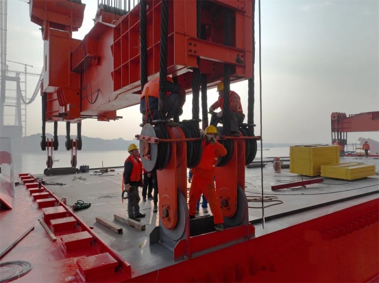 “經(jīng)過周密部署和精心準(zhǔn)備,第一節(jié)鋼梁架設(shè)比施工安排提前了3天?!敝需F大橋局G3大橋項(xiàng)目部一分部副經(jīng)理任引亮介紹,鋼梁由1600噸架梁吊機(jī)從江面駁船上吊到43米高的主塔下橫梁上,與導(dǎo)梁精準(zhǔn)拼接,隨即將已拼接鋼梁節(jié)段及架梁吊機(jī)整體向邊跨方向頂推,而后架梁吊機(jī)向主跨位置走行至架梁位置處繼續(xù)提升鋼梁,如此循環(huán)直至將邊輔跨鋼梁全部安裝完畢。