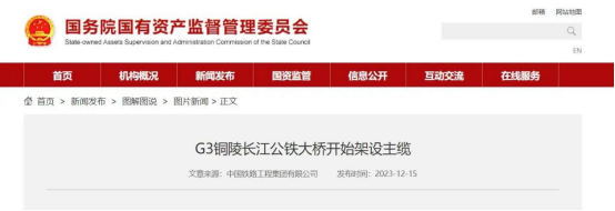 12月15日,國務院國資委官網(wǎng)報道由我司投資建設、中鐵大橋局承建的G3銅陵長江公鐵大橋最新進展。正文具體內(nèi)容如下: