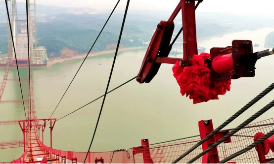 針對這種全新的橋型,項目團隊提出“單側(cè)同步、南北異步、體系同步”的指導性施工原則,制定斜拉段和懸吊段同步架設安裝的總體施工工序,主纜采用預制平行索股法進行架設,即預先將若干鋼絲組合成正六邊形截面的平行鋼絲束,用纖維強力帶包扎成平行鋼絲索股,兩端安裝錨頭,利用雙線往復式牽引系統(tǒng)架設索股,全部索股架設完成后,利用緊纜機將所有索股形成一根主纜,成為大橋的主要承重結(jié)構(gòu)。