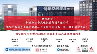 2月29日,銅陵市綜合交通投資集團(tuán)有限公司2024年第一期面向?qū)I(yè)投資者非公開(kāi)公司債券成功發(fā)行,規(guī)模5億元,期限3年,票面利率3.0%,主承銷商華安證券,聯(lián)席主承銷商國(guó)金證券。本次債券發(fā)行創(chuàng)市交投集團(tuán)在資本市場(chǎng)融資最低發(fā)行利率!同時(shí)創(chuàng)安徽省有史以來(lái)同類型、同期限、同評(píng)級(jí)最低票面利率!