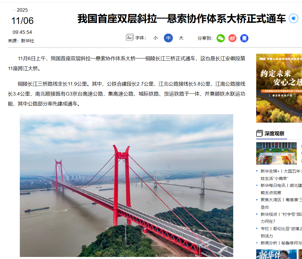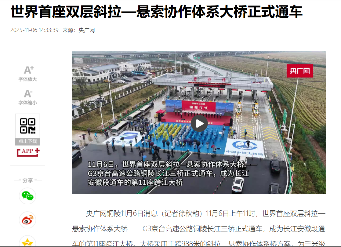 2025年11月6日,由銅陵交投集團投資建設、中鐵大橋院設計、中鐵大橋局施工的宏偉工程——世界首座公鐵兩用雙層斜拉—懸索協(xié)作體系大橋銅陵長江三橋正式通車,引發(fā)各大主流媒體高度關注。央視新聞、新華社、人民網(wǎng)等中央媒體全程直播報道,安徽日報、銅陵日報等省市媒體推出深度專題,海外網(wǎng)等網(wǎng)絡平臺多維呈現(xiàn),形成全方位、立體化的傳播矩陣。