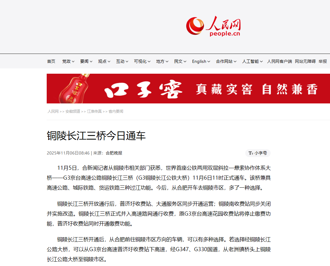 3.人民網(wǎng)安徽頻道發(fā)布《銅陵長江三橋今日通車》。 鏈接地址: