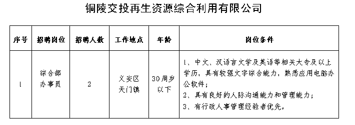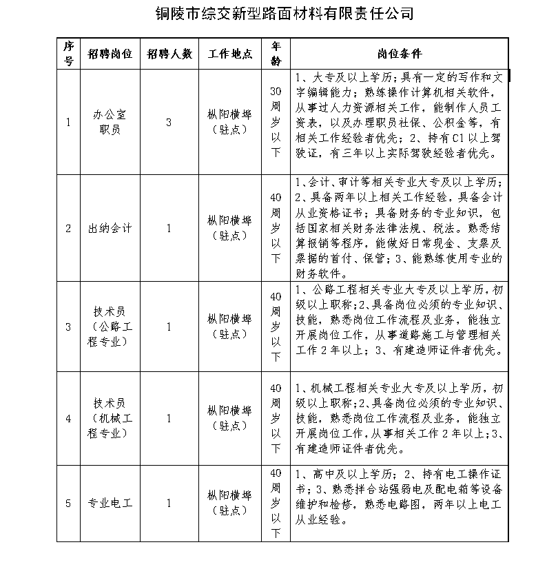 因業(yè)務(wù)發(fā)展需要,我公司司屬公司銅陵市綜交新型路面材料有限責(zé)任公司、銅陵交投再生資源綜合利用有限公司現(xiàn)面向社會(huì)公開(kāi)招聘若干名工作人員,具體事項(xiàng)公告如下: