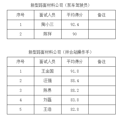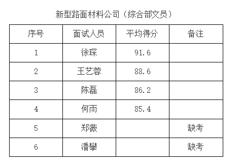 根據(jù)《銅陵市綜交新型路面材料有限責任公司公開招聘人員公告》,我公司已于2021年9月5日開展銅陵市綜交新型路面材料有限責任公司相關(guān)崗位面試工作,現(xiàn)將面試成績公示如下: