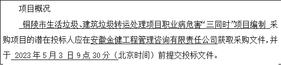 采購需求:銅陵市生活垃圾、建筑垃圾轉運處理項目職業(yè)病危害“三同時”項目編制,詳見招標文件項目需求內容。