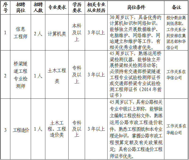 2.報名方式:采取網(wǎng)上投遞簡歷方式報名,凡有意應聘上述招聘崗位且符合崗位要求的人員,請將報名表、個人簡歷、有關(guān)證件掃描件(學歷證書、職稱證書、職(執(zhí))業(yè)證書、身份證等)發(fā)至報名郵箱:4060356@qq.com,或郵寄地址:銅陵市北京北斗星城3-C6C7棟1102號(銅陵市綜合交通投資集團有限公司收)。