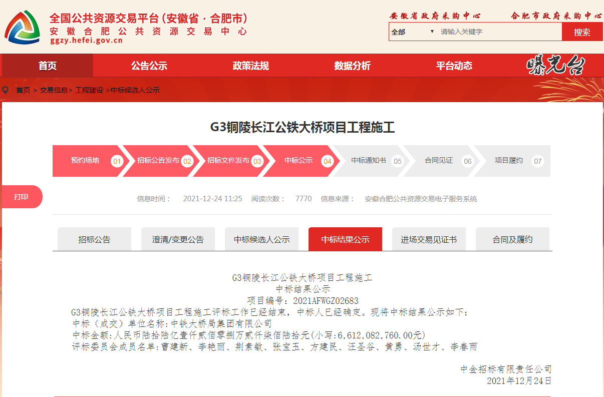 安徽合肥公共資源交易中心鏈接:G3銅陵長江公鐵大橋項目工程施工中標(biāo)候選人公示