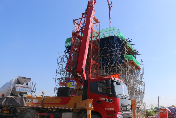 跨G347國道特大橋全長(zhǎng)2.39公里(74孔),其中第42-44孔采用1聯(lián)(32+48+32)混凝土連續(xù)梁上跨G347國道,該連續(xù)梁采用懸臂澆筑法施工。此次澆筑的43#主墩0#塊長(zhǎng)8米、頂寬7.6米、高3.4米,總重約230噸,其中混凝土用量89.5方、鋼筋用量14.6噸,采用盤扣式滿堂支架整體澆筑。